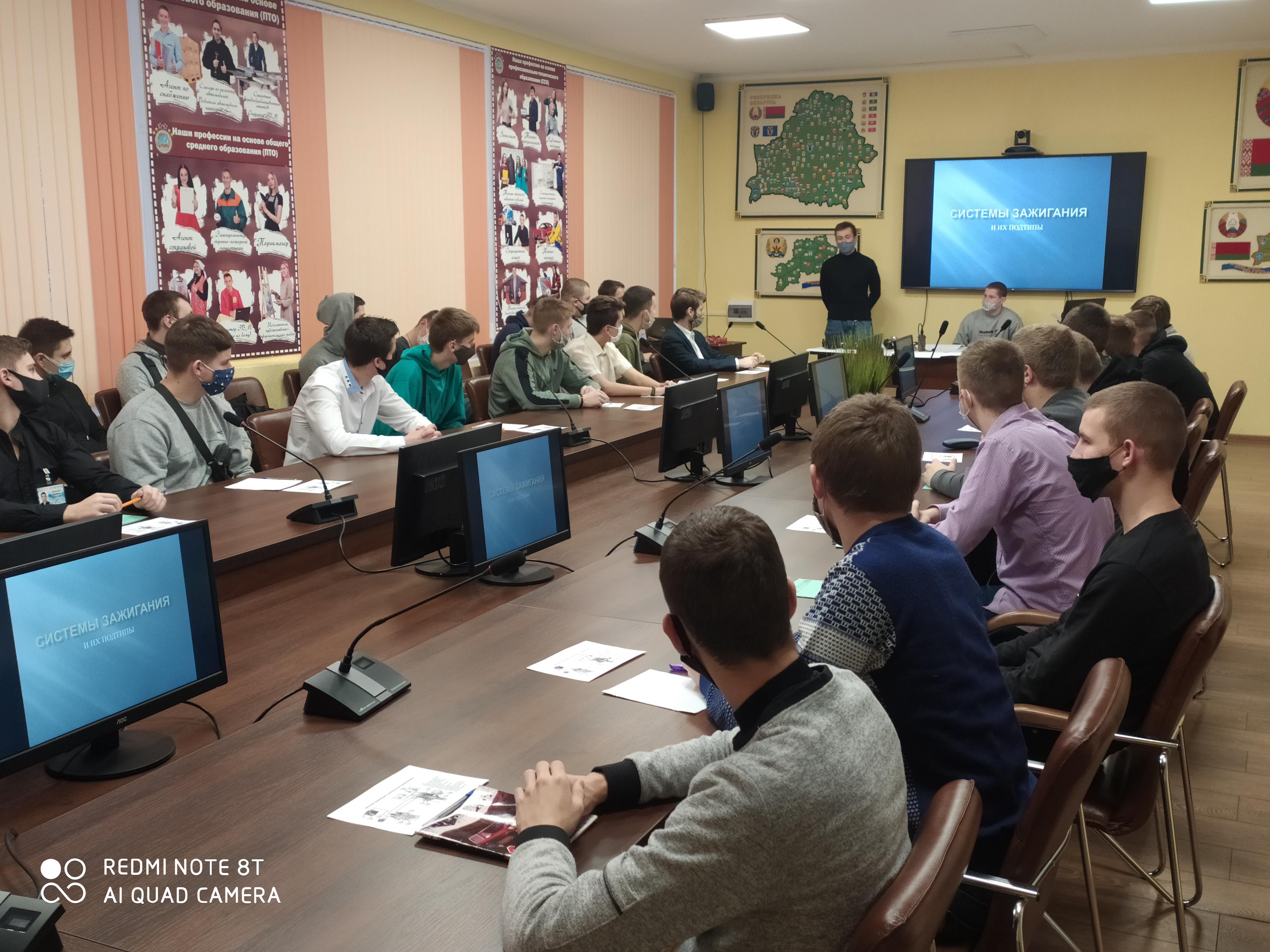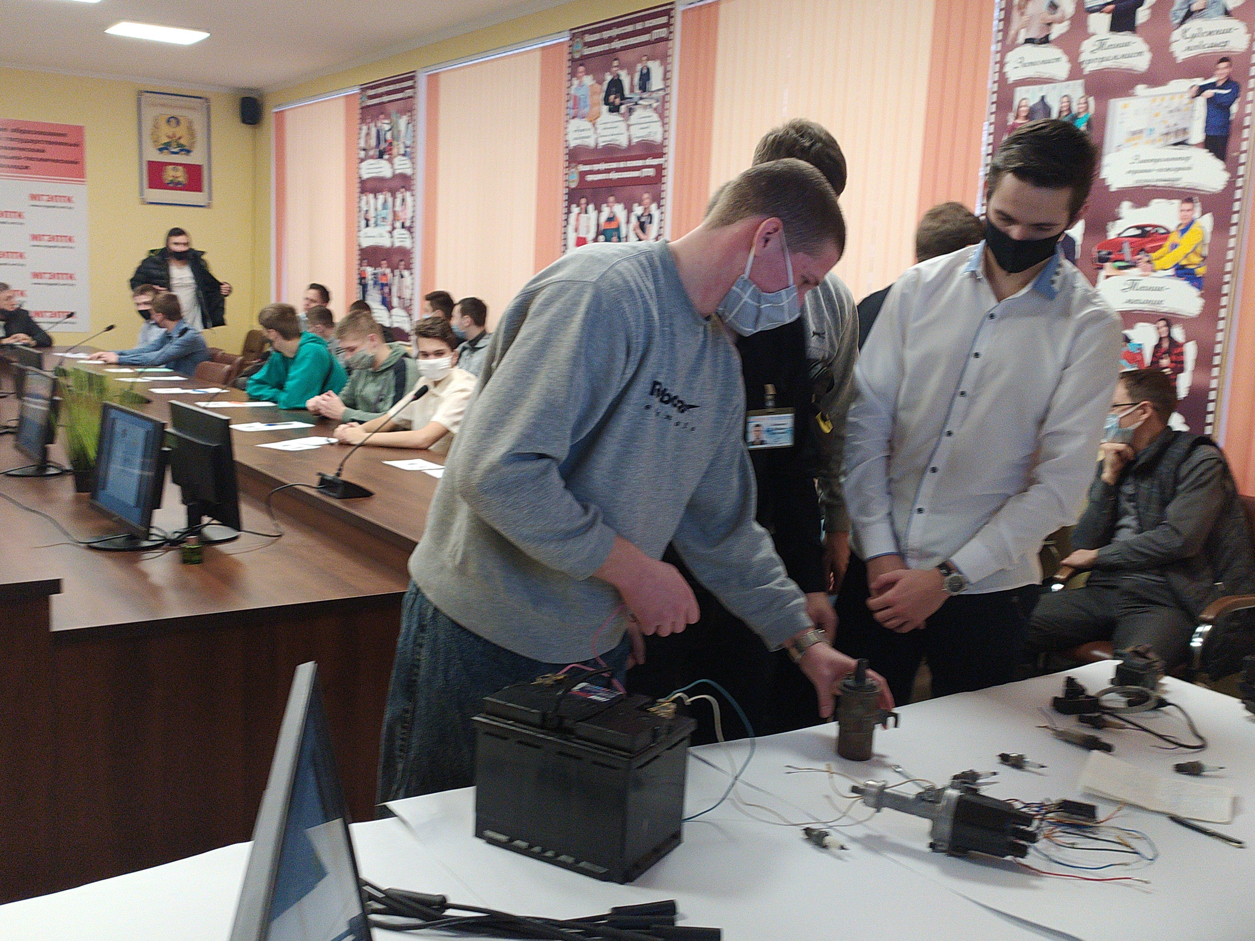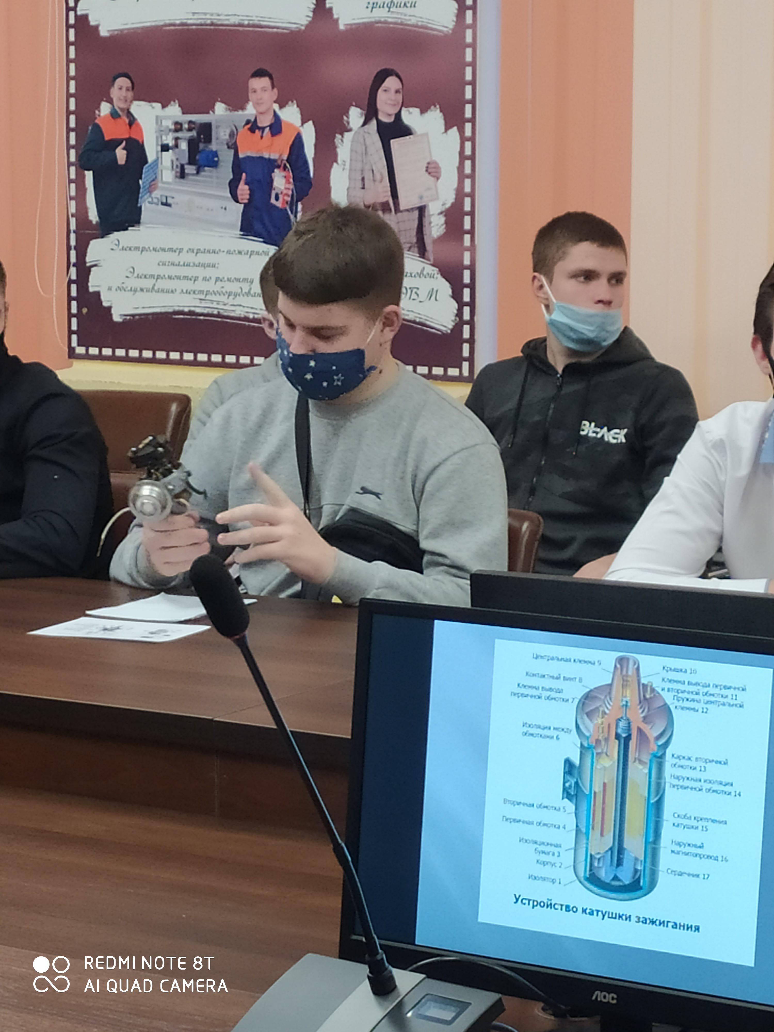 Учащиеся группы 2-132 Комаров Артем и Бутьков Максим с наглядной демонстрацией рассказали о разных типах систем зажигания, показали ее  составляющие, а учащиеся группы 19 в итоге смогли собрать самостоятельно систему зажигания автомобиля.