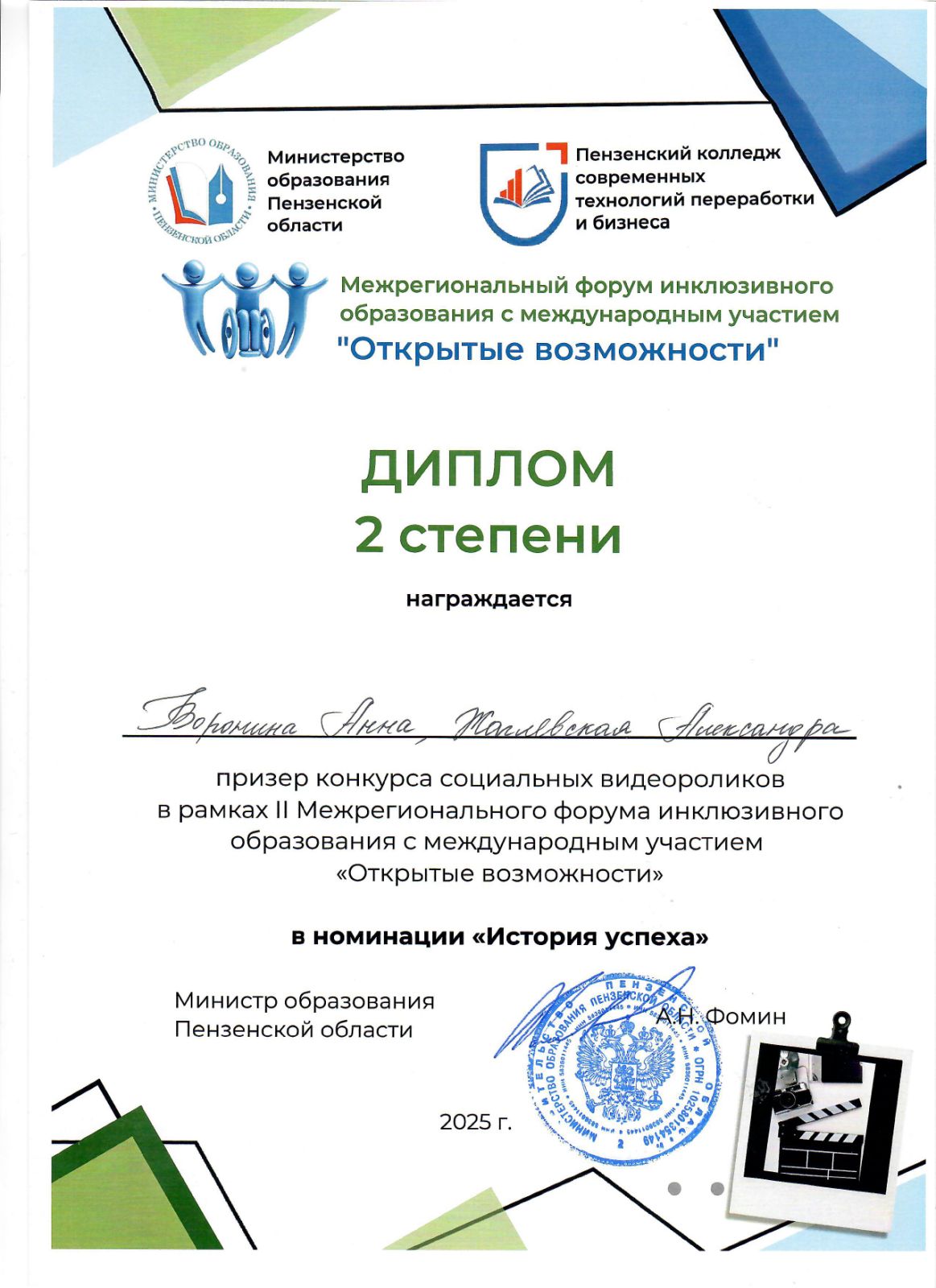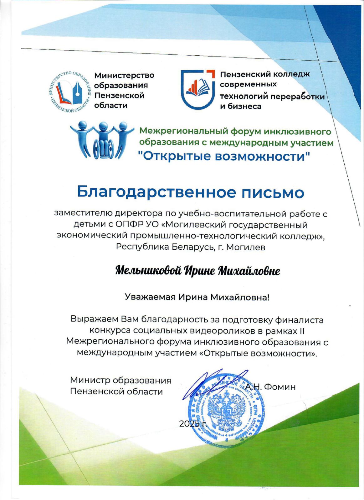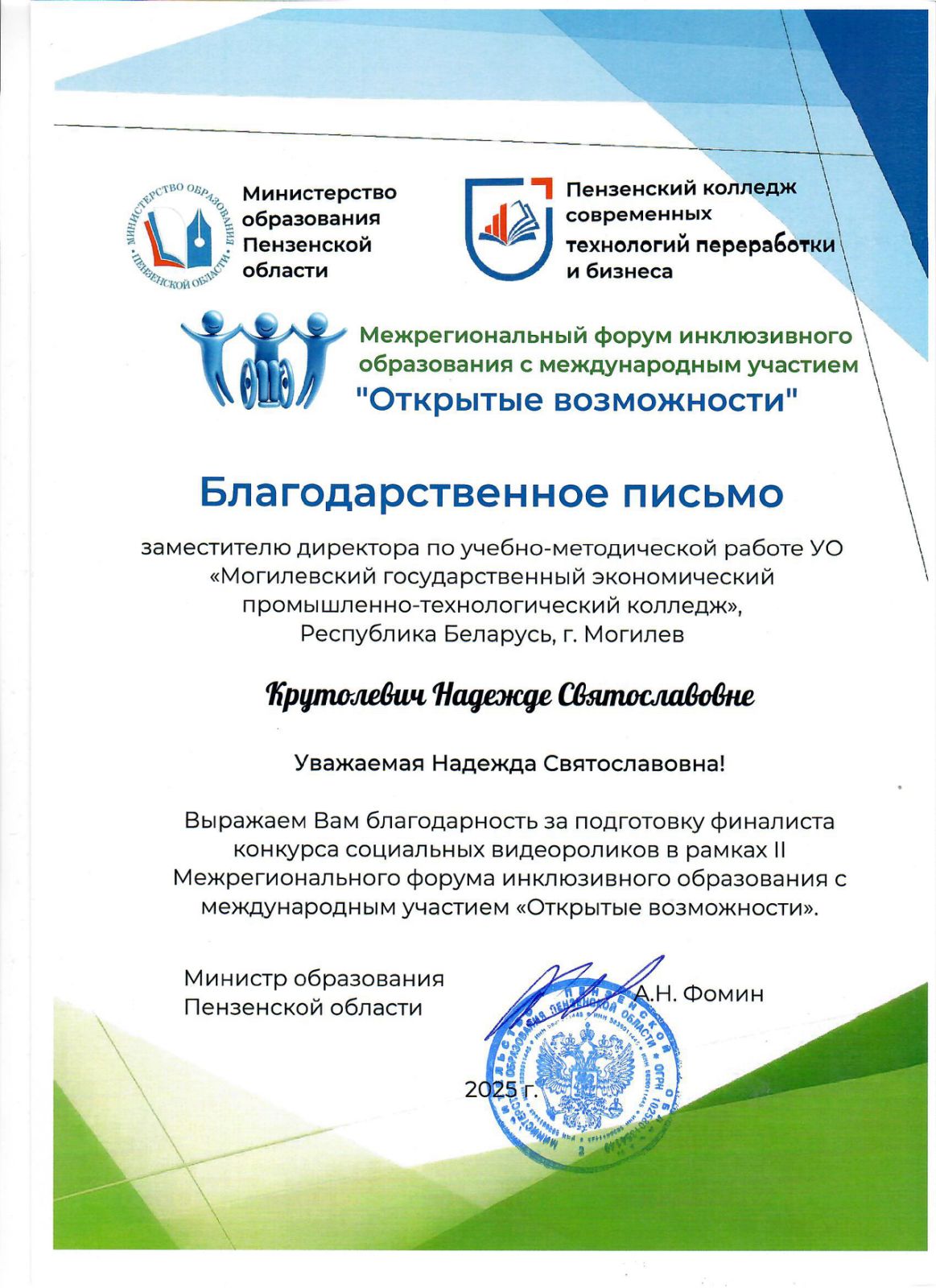 В рамках Межрегионального форума инклюзивного образования с международным участием в конкурсе социальных видеороликов работа представителей Могилевского государственного экономического промышленно-технологического колледжа была удостоена награды.