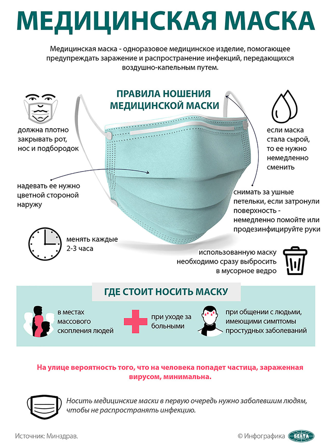 При использовании медицинских масок (одноразовых) необходимо соблюдать следующие правила: