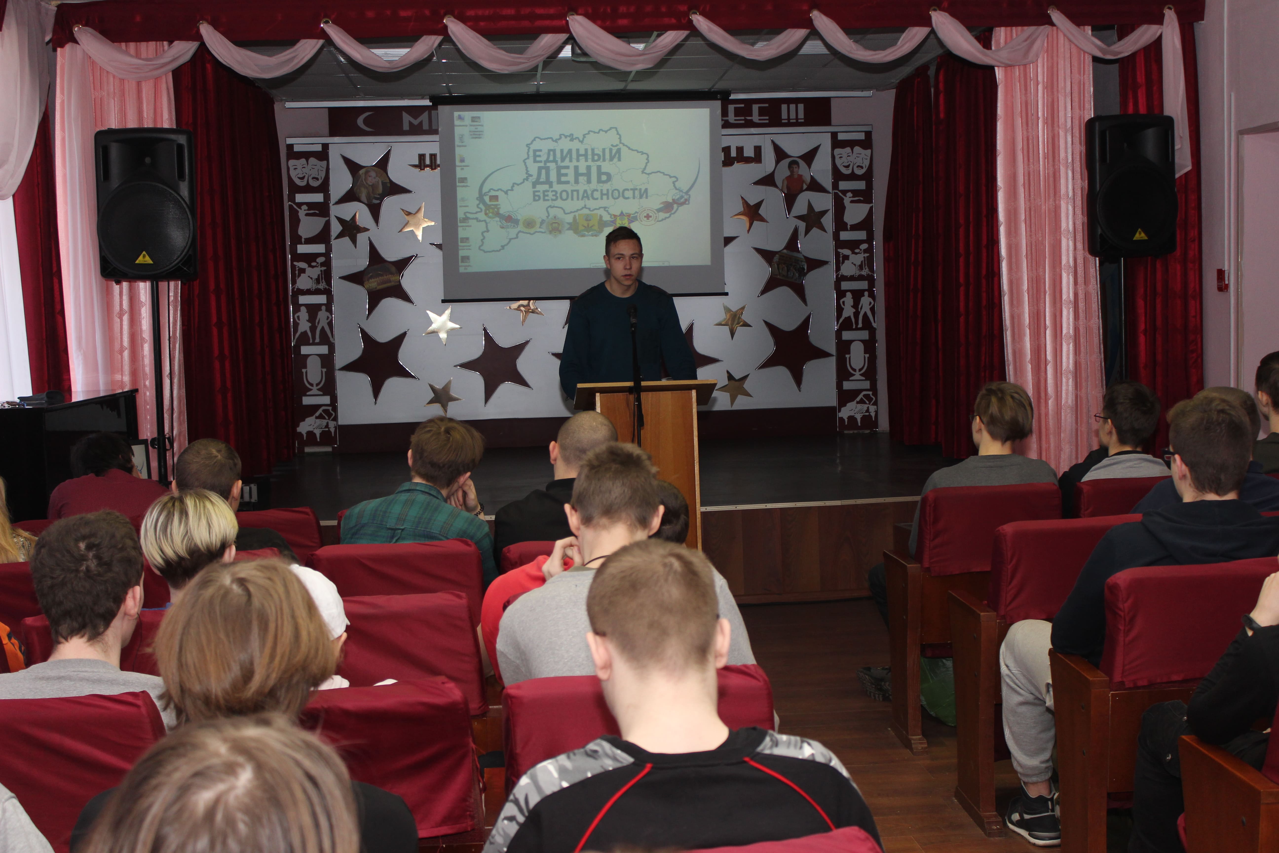 28 февраля в рамках акции «Единый день безопасности» тематическое занятие по вопросам безопасного поведения при организации образовательного процесса, во внеурочное время, во время досуга, в ситуациях, угрожающих жизни, с учащимися колледжа провел сотрудник Могилевского городского отдела по чрезвычайным ситуациям.