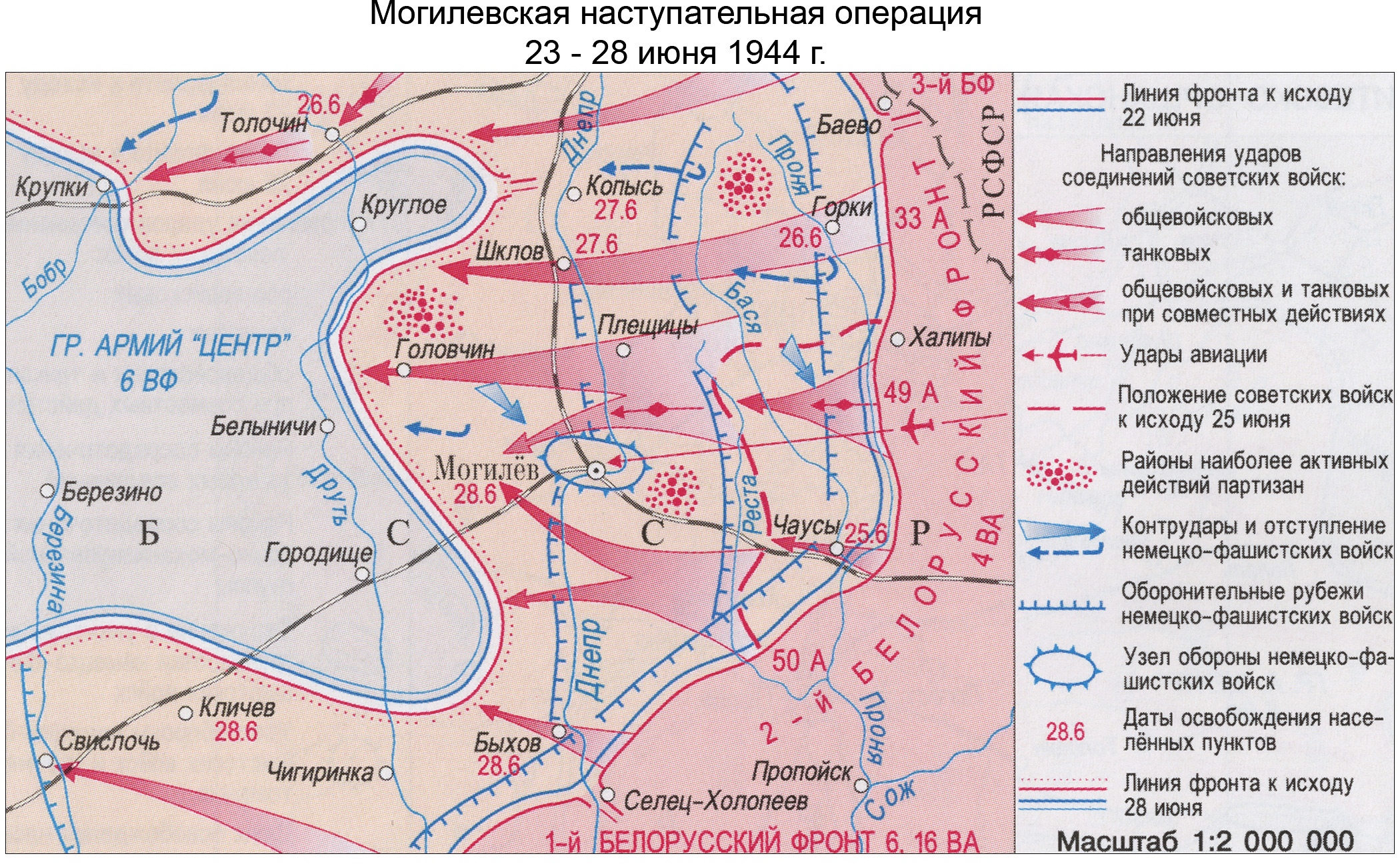 Войска 2-го Белорусского фронта, форсировав реку Днепр, на участке протяженностью 120 километров, прорвали вторую оборонительную полосу немцев, и штурмом овладели крупным областным центром Беларуси - городом Могилев, а также с боями заняли районные центры Могилёвской области города Шклов и Быхов, а также более 450 других населённых пунктов.