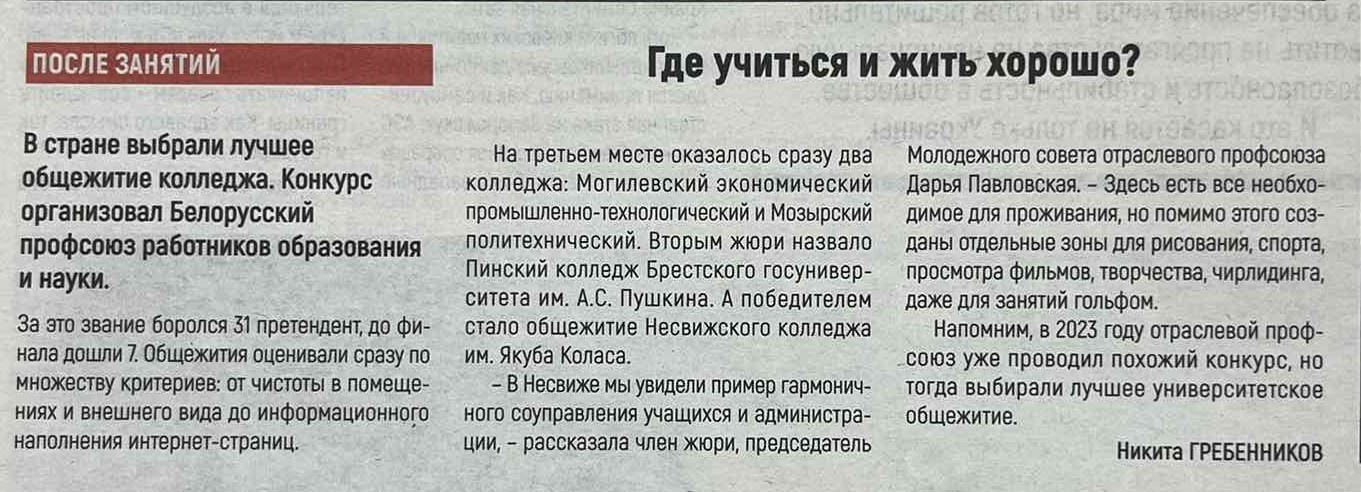 Общежитие Могилевского государственного экономического промышленно-технологического колледжа признано одним из лучших в стране. Об этом пишут в газете Федерации профсоюзов Беларуси "Беларускі час". Колледж располагает не только современной материально-технической базой, имеет профессиональный кадровый состав, но размещает всех своих учащихся в комфортабельном общежитии, где созданы все условия для их проживания, успешной учебы, полезного и здорового досуга. Уже совсем скоро общежитие гостеприимно распахнет свои двери и будущим первокурсникам.