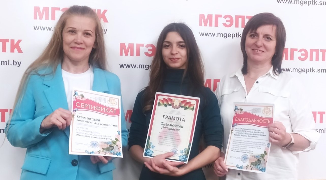 I место в IV международном творческом видео-марафоне «Мы о войне стихами говорим», посвященном празднованию 78-й годовщины Победы советского народа в Великой Отечественной войне, заняла учащаяся УО «Могилевский государственный экономический промышленно-технологический колледж» Кузьменкова Анастасия!