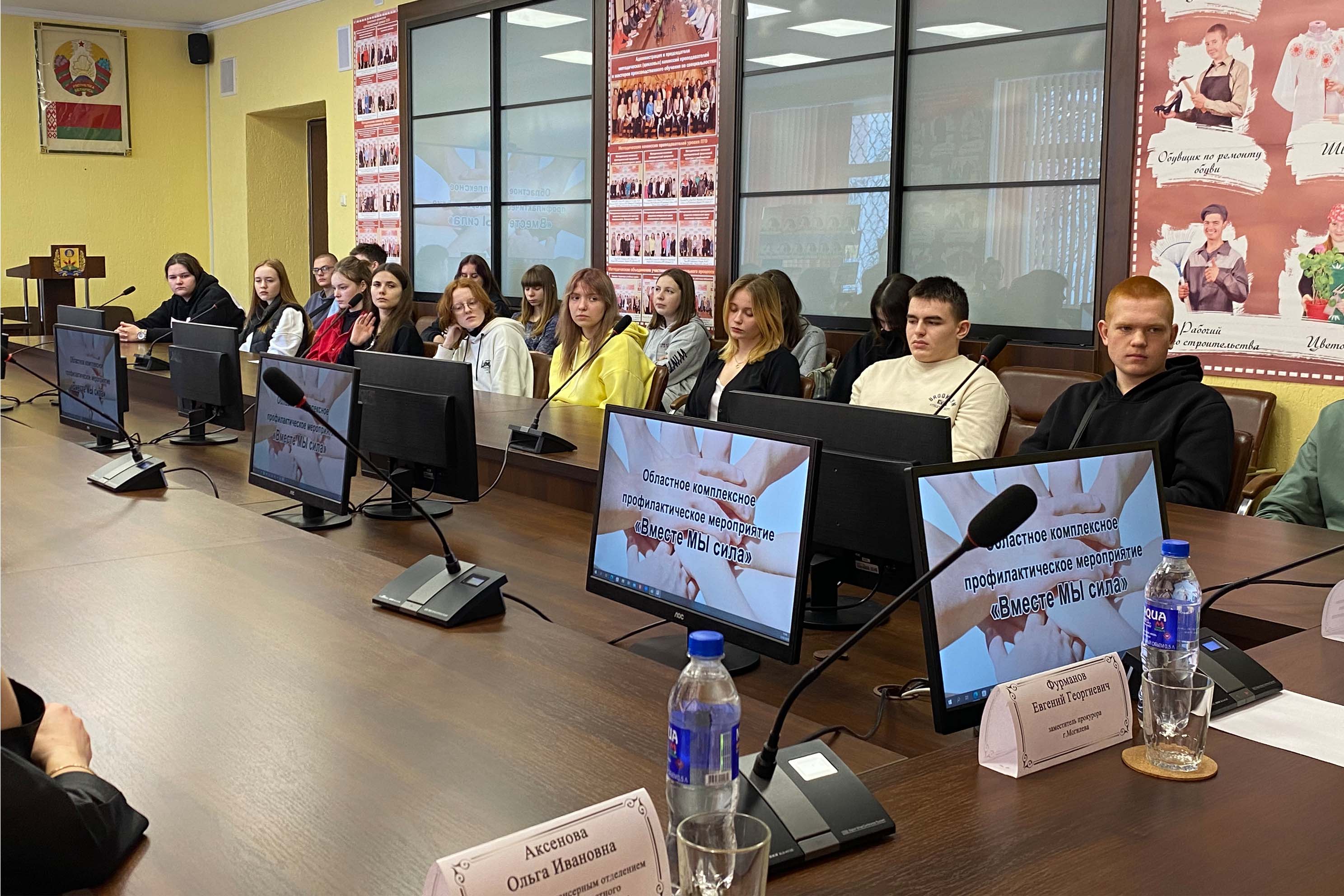 22 февраля в рамках областной антинаркотической межведомственной акции «Вместе против наркотиков» с учащимися колледжа встретились заместитель прокурора города Могилева Фурманов Евгений Георгиевич, заместитель председателя комиссии по делам несовершеннолетних Могилевского городского исполнительного комитета Короткевич Инна Федоровна, заведующий диспансерным отделением Могилевского областного наркологического диспансера Аксенова Ольга Ивановна.
