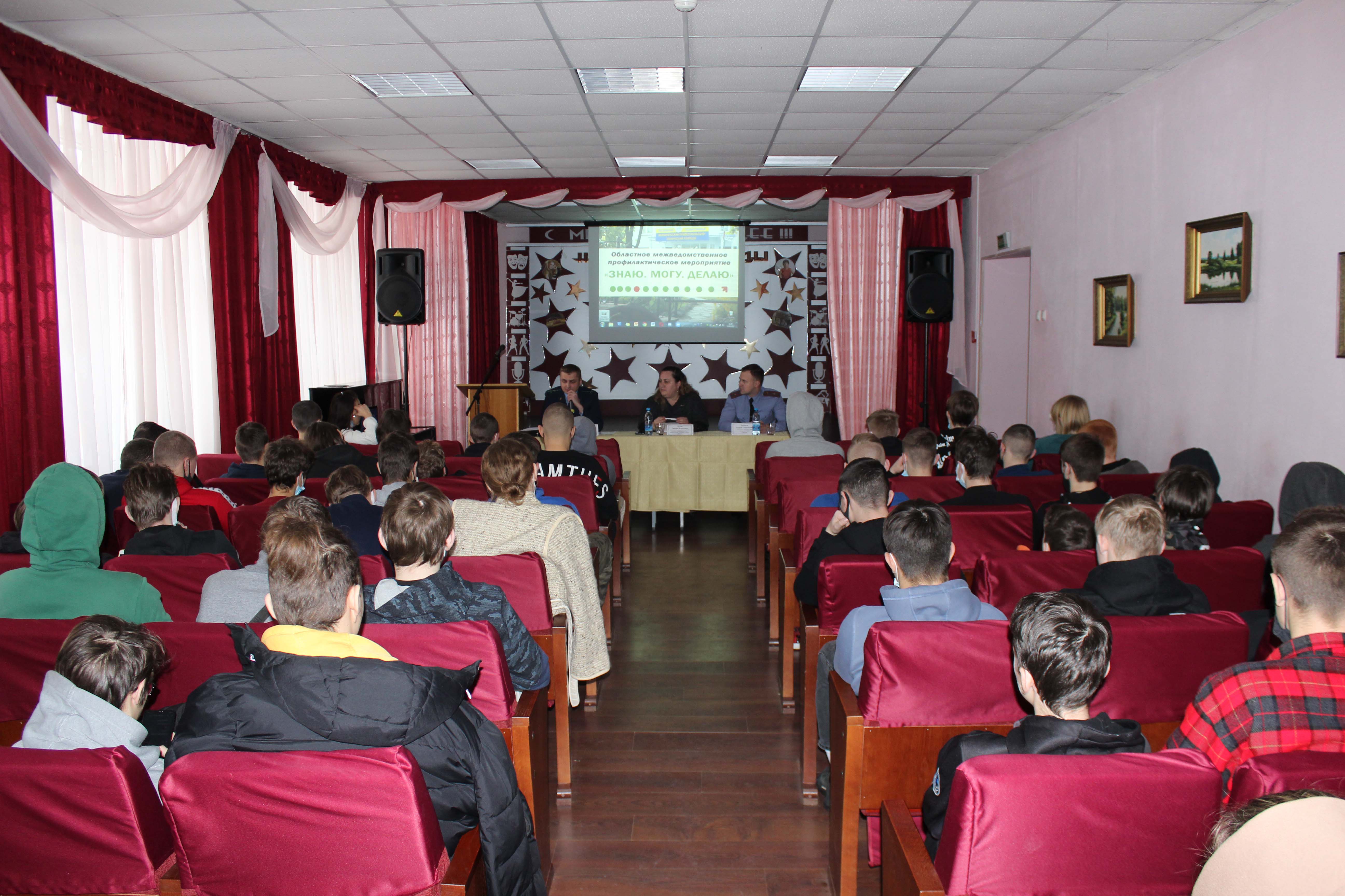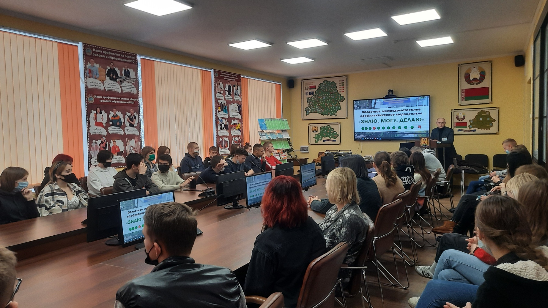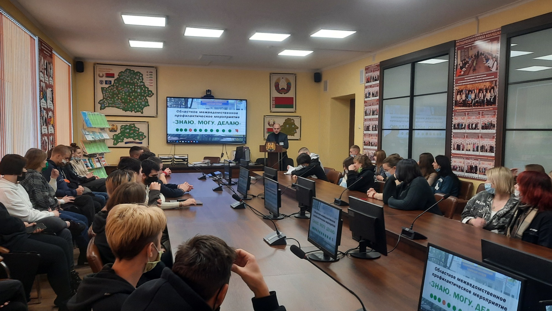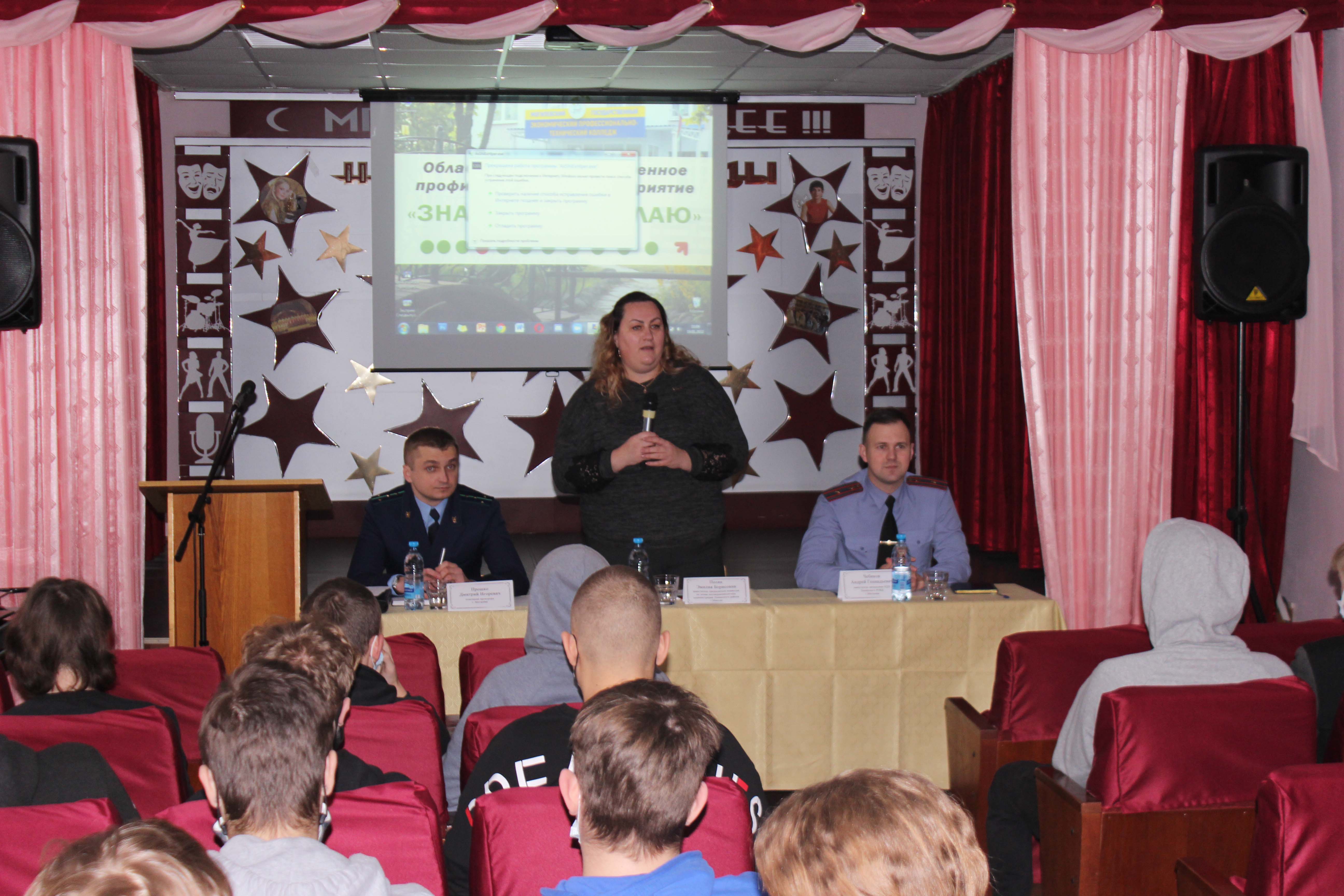 19 января в рамках проведения областного межведомственного профилактического мероприятия «ЗНАЮ.МОГУ.ДЕЛАЮ» состоялась встреча учащихся колледжа с представителями межведомственной группы, в состав которой вошли помощник прокурора г.Могилева, заместитель председателя комиссии по делам несовершеннолетних администрации Ленинского района г. Могилева, заместитель начальника инспекции по делам несовершеннолетних ОВД Ленинского района г. Могилева. Учащиеся посмотрели видеофильм информационно-профилактической направленности и получили ответы на интересующие их вопросы по основам правовых знаний.
