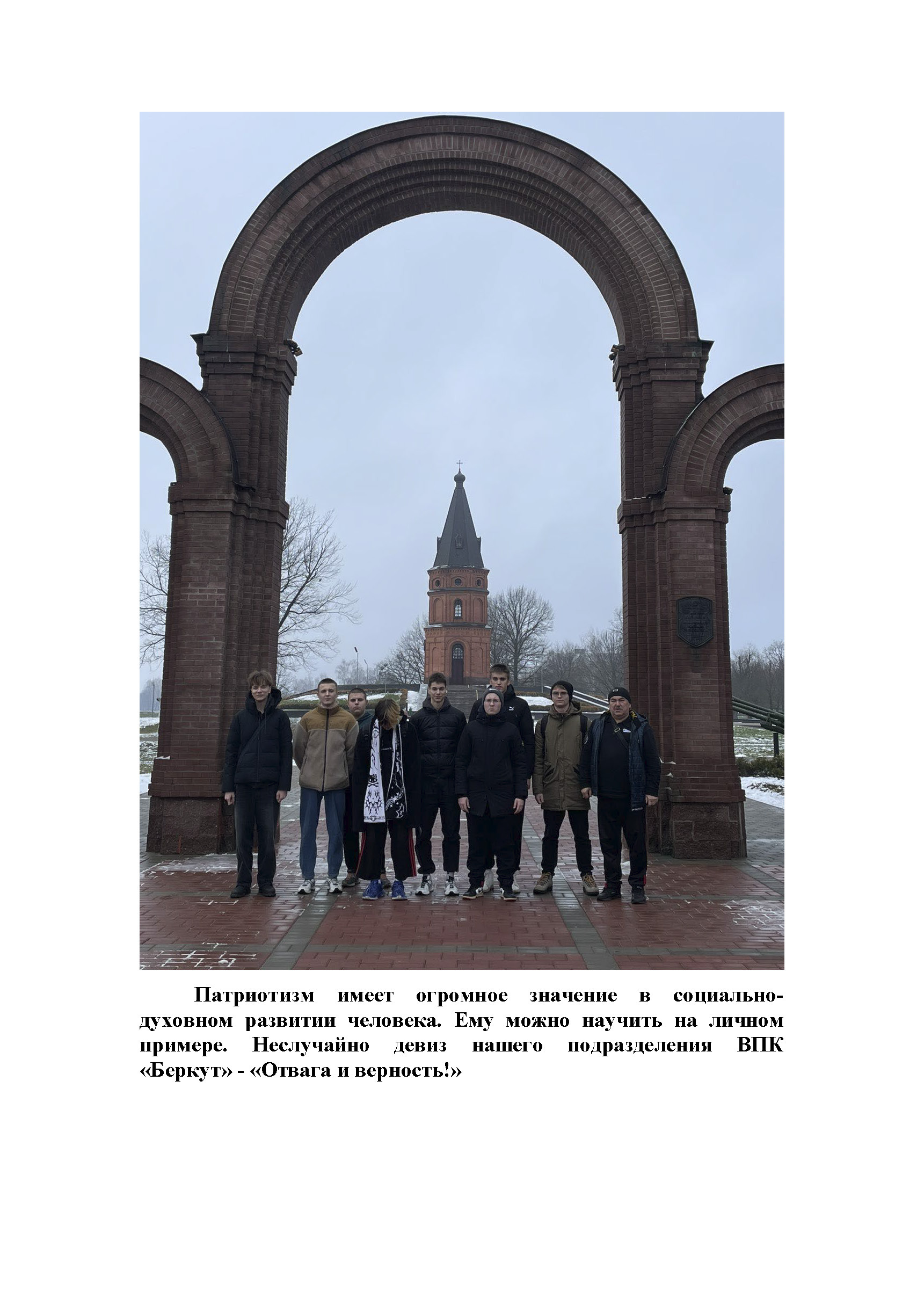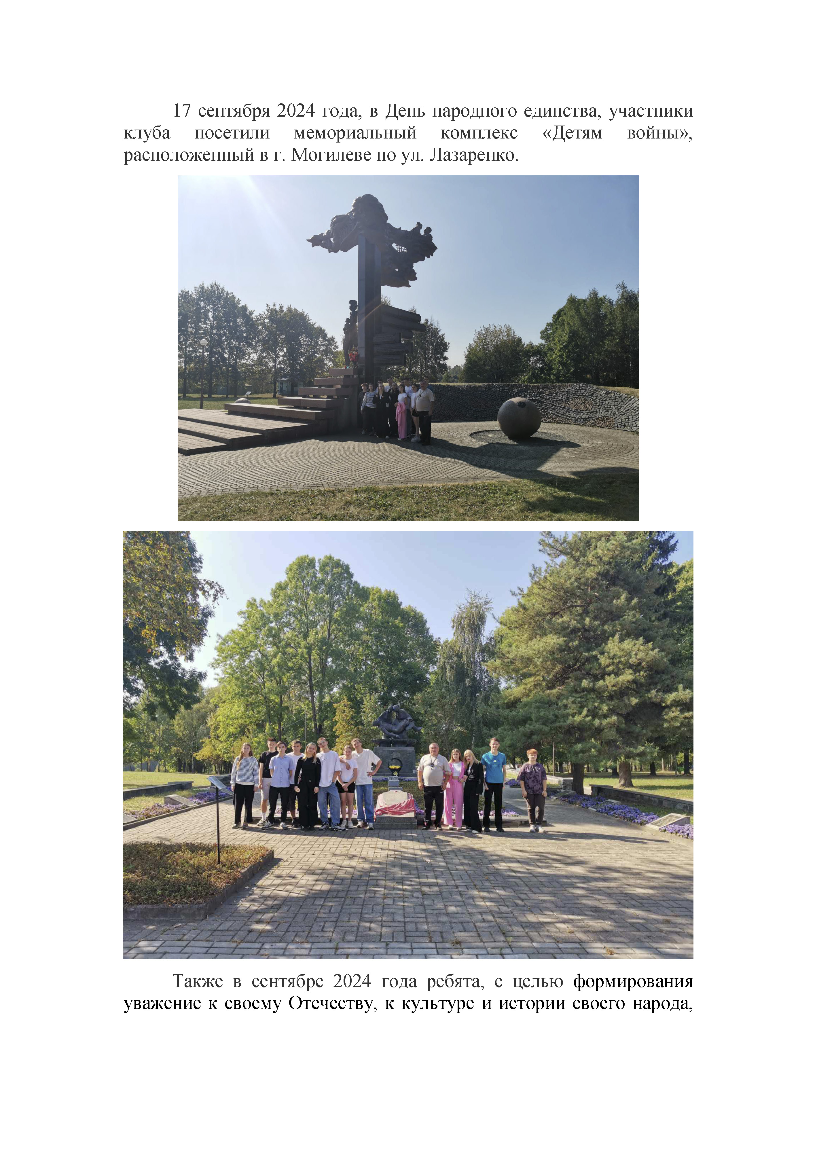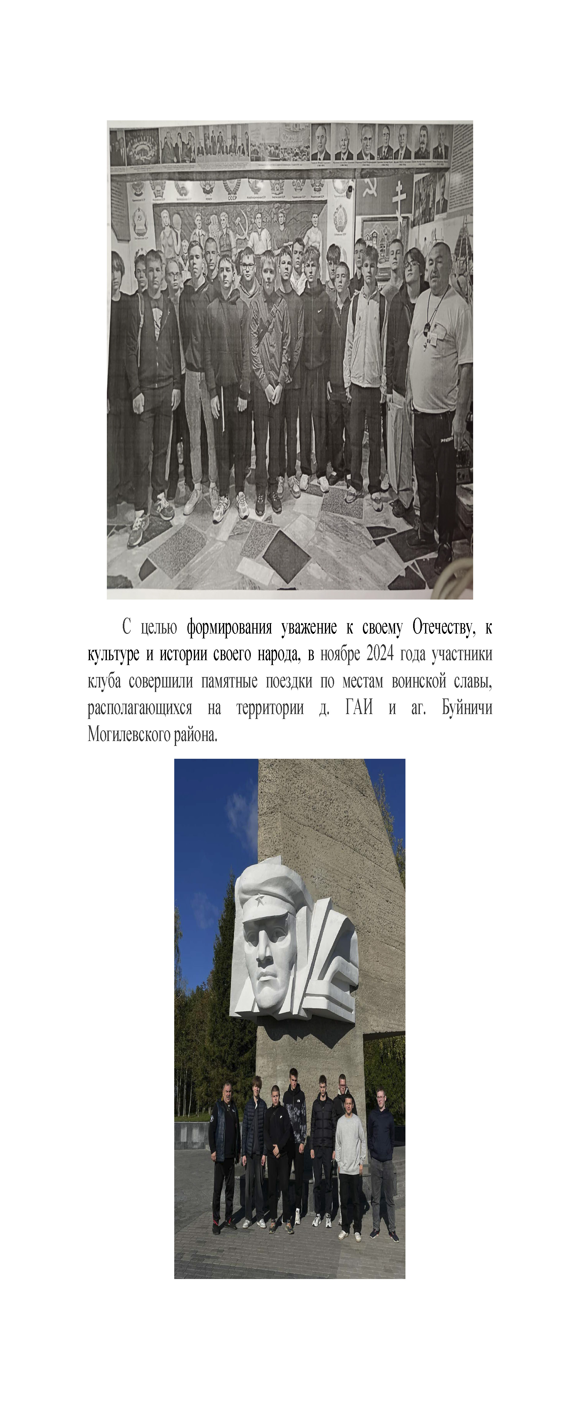 Одной из эффективных форм патриотического воспитания, приобщения учащихся к духовному наследию народа являются походы и экскурсии по родному краю. Туристические и экскурсионные маршруты проходят через места, которые раскрывают героические страницы прошлого нашего народа. Навсегда останутся в памяти у ребят и инженерно-педагогических работников экскурсионные поездки в Хатынь, на Курган Славы, в Минск, в деревню Лесная, Мирский и Несвижский замки, героический Брест, а также на родину Президента – в деревню Александрия.